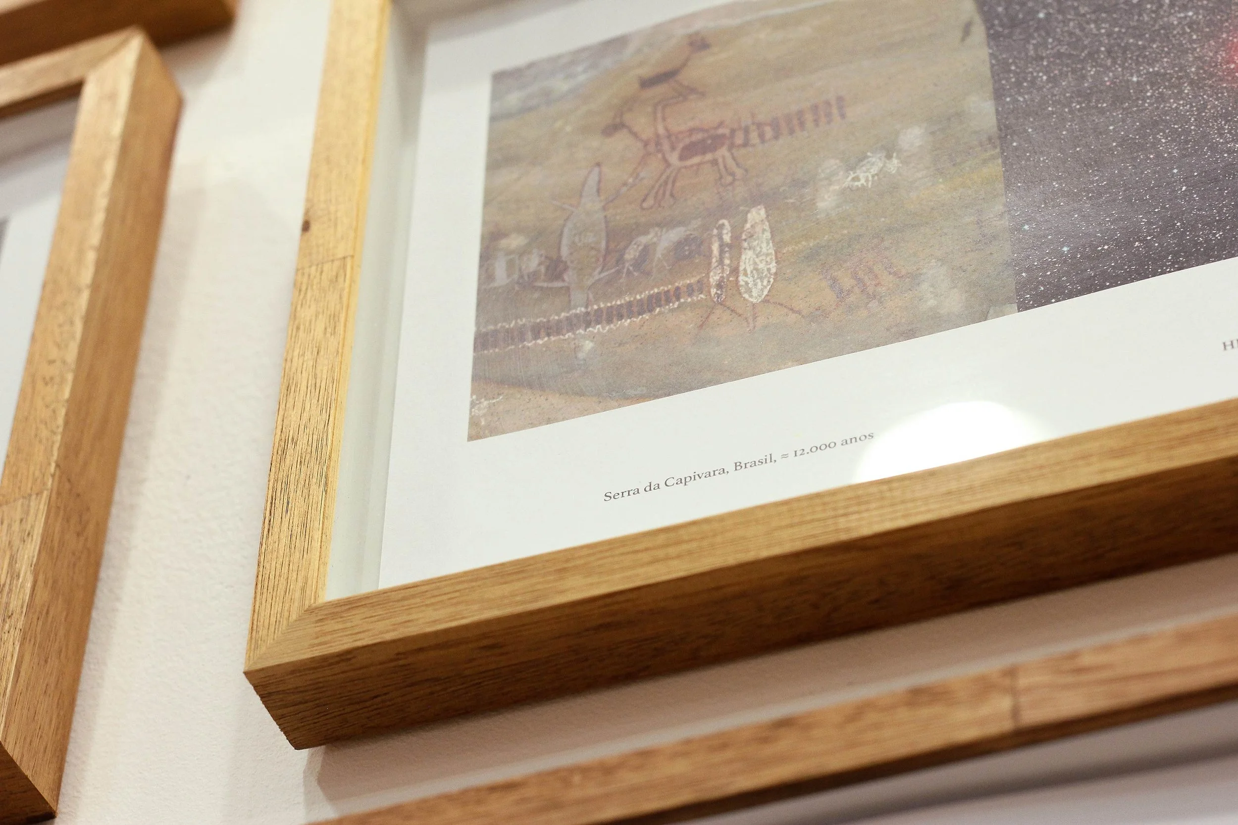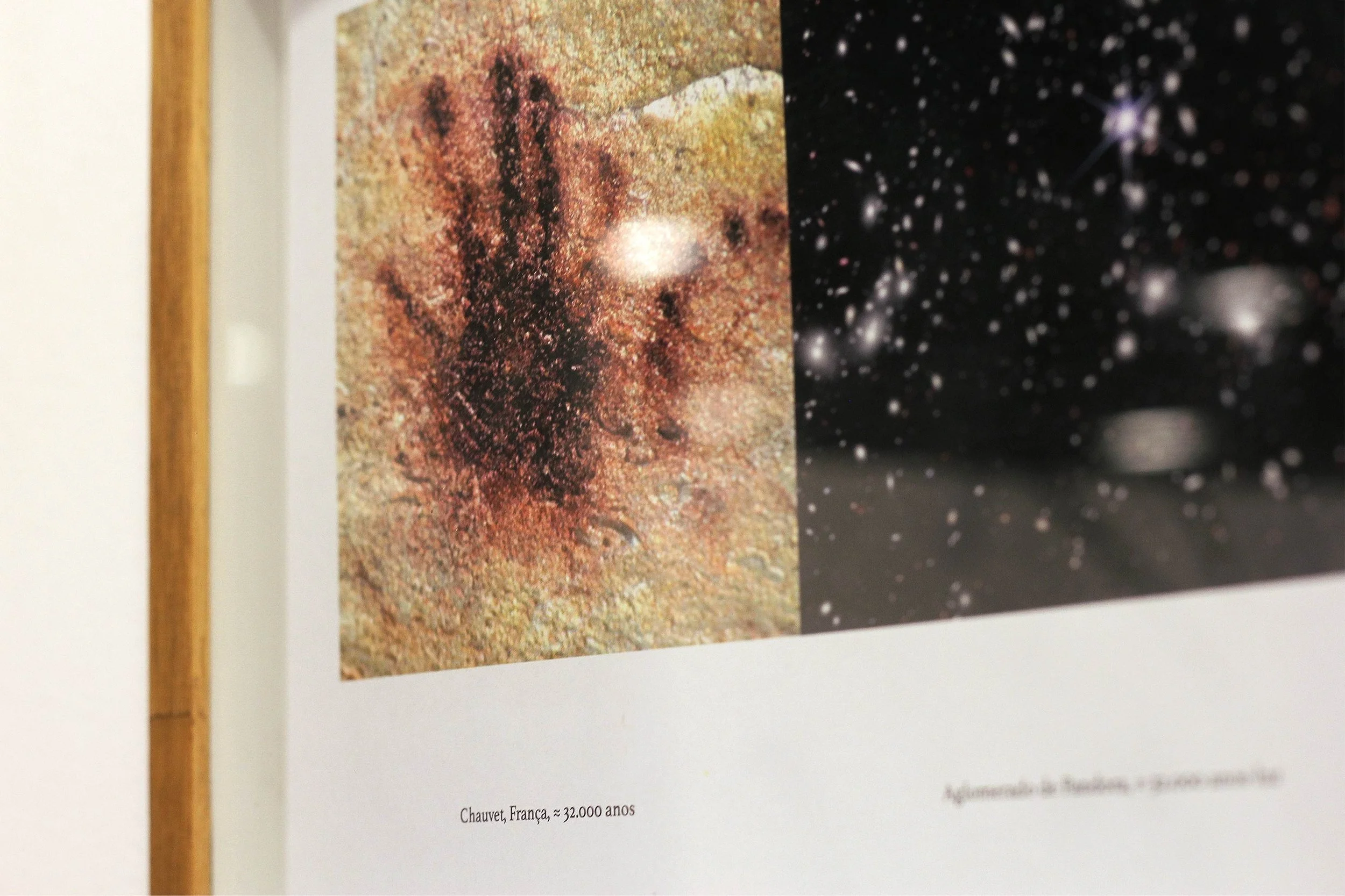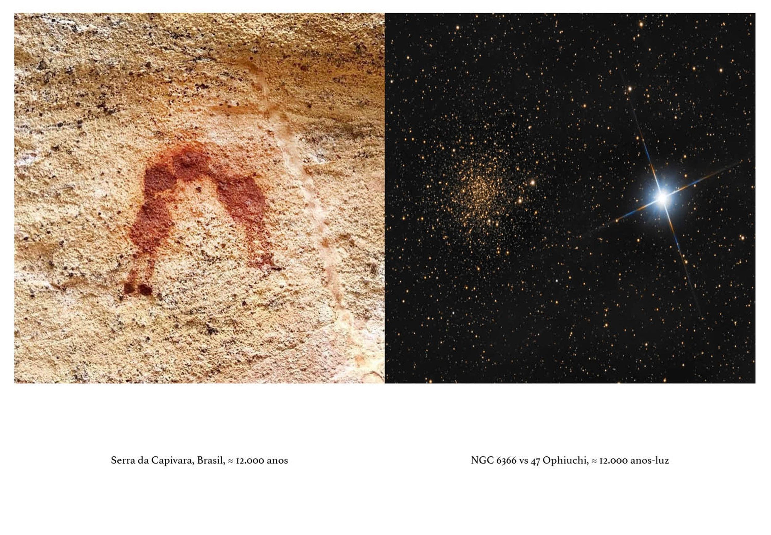 Na colagem abaixo, à esquerda, imagem do interior da caverna de Chauvet, França, mostrando pinturas rupestres que datam de aproximadamente 32.000 anos. À direita, imagem telescópica do Aglomerado M80, situado a aproximadamente 32.000 anos-luz da Terra. Em sequência, parte das doze colagens que compõem Ano-Luz.